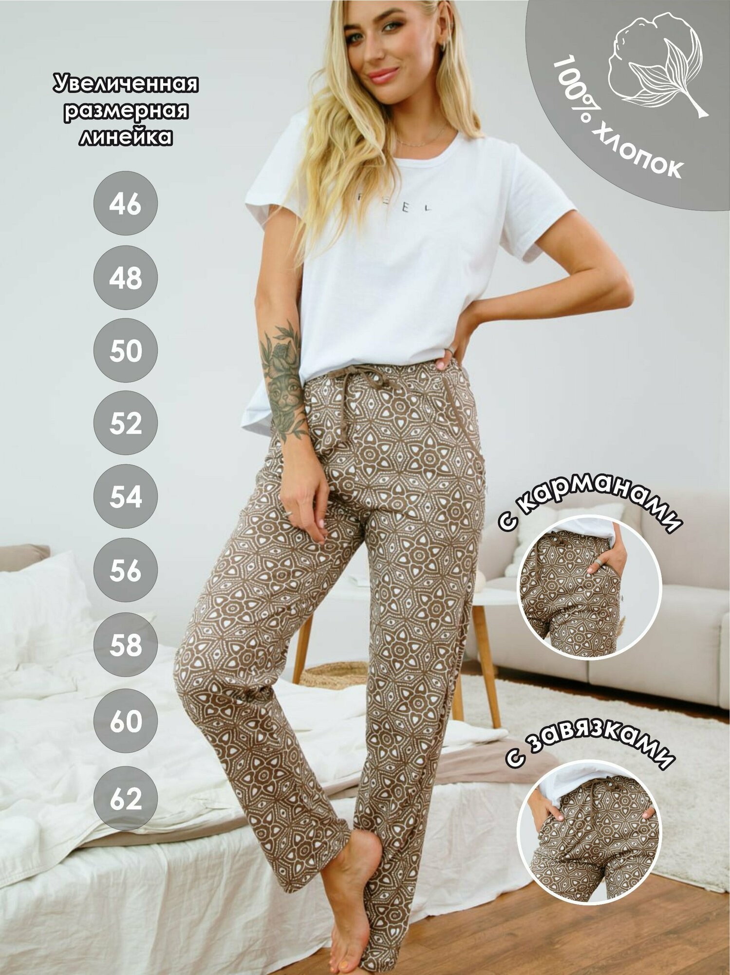 Брюки женские Ohana market/Женские штаны/Для дома/Пижамные брюки/Хлопок 100%, размер 54 информация: