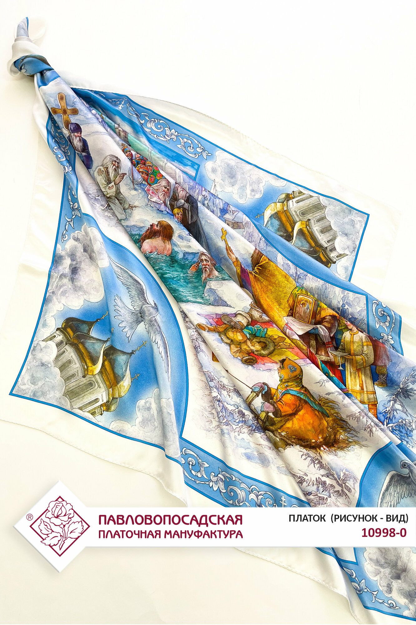 Платок на голову женский шелковый Павловопосадские платки 10998 "Праздник крещения" вид 0, голубой 89х89 см информация: