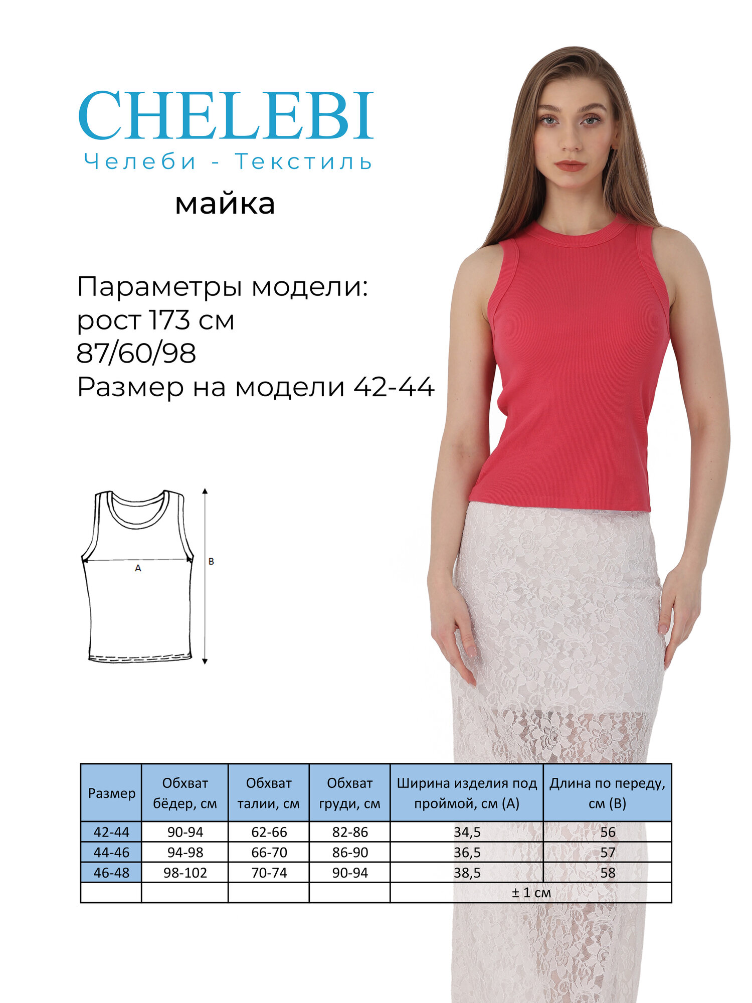 | Дополнительная информация | майка в рубчик, топ спортивный, майка лапша, длина изделия по спинке - 56 см |