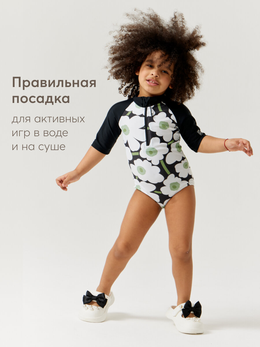Отзывы на 50657, Купальник слитный детский для девочек, защита от солнца UPF 50+ Happy Baby с длинным рукавом, на молнии, солнцезащита, черная с цветами, 104-110