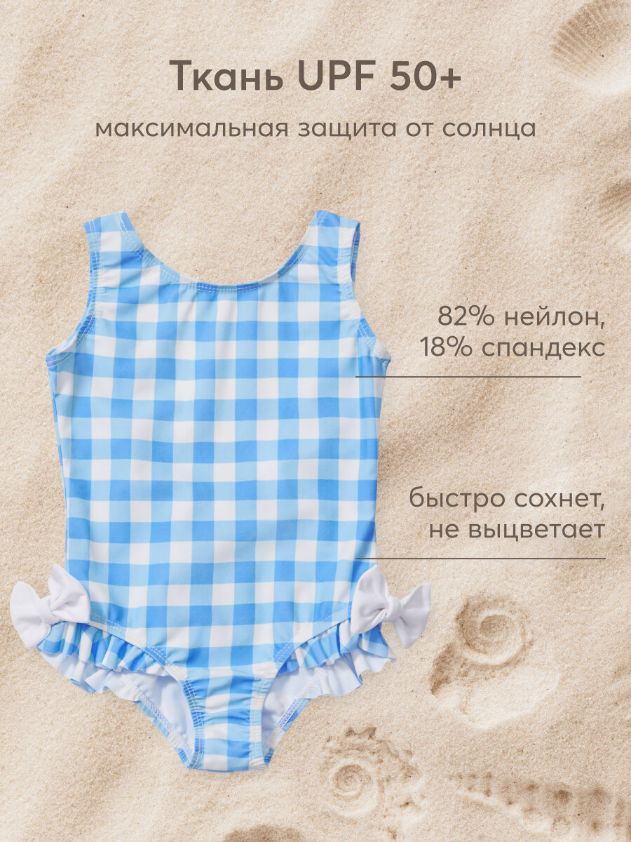 50658, Купальник детский для девочки Happy Baby, слитный с открытой спиной, для пляжа и для бассейна голубой в клетку, размер 116-122 информация: