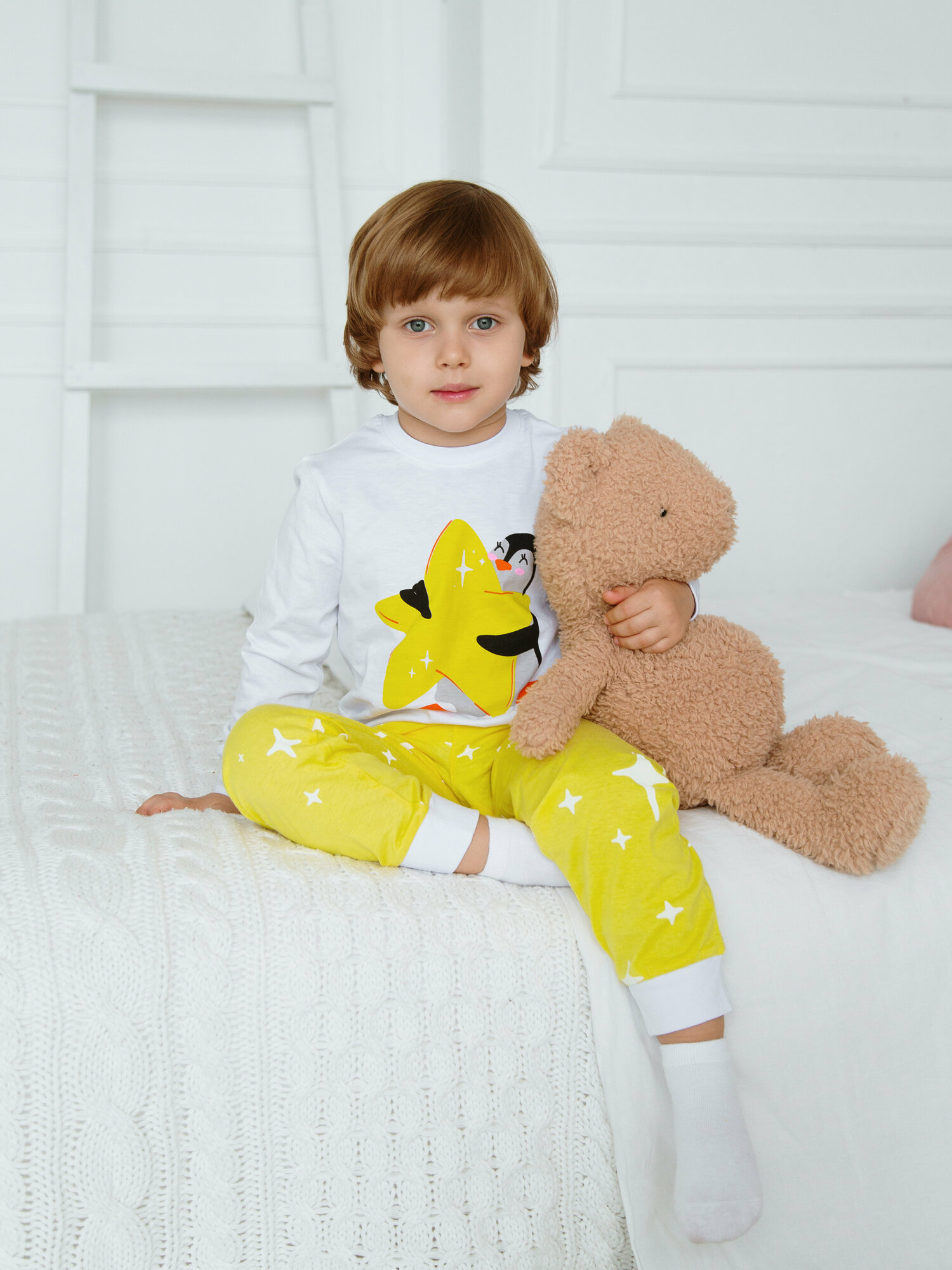 Пижама Ohana kids Девочкам и мальчикам, размер 122, белый/желтый 901 ₽