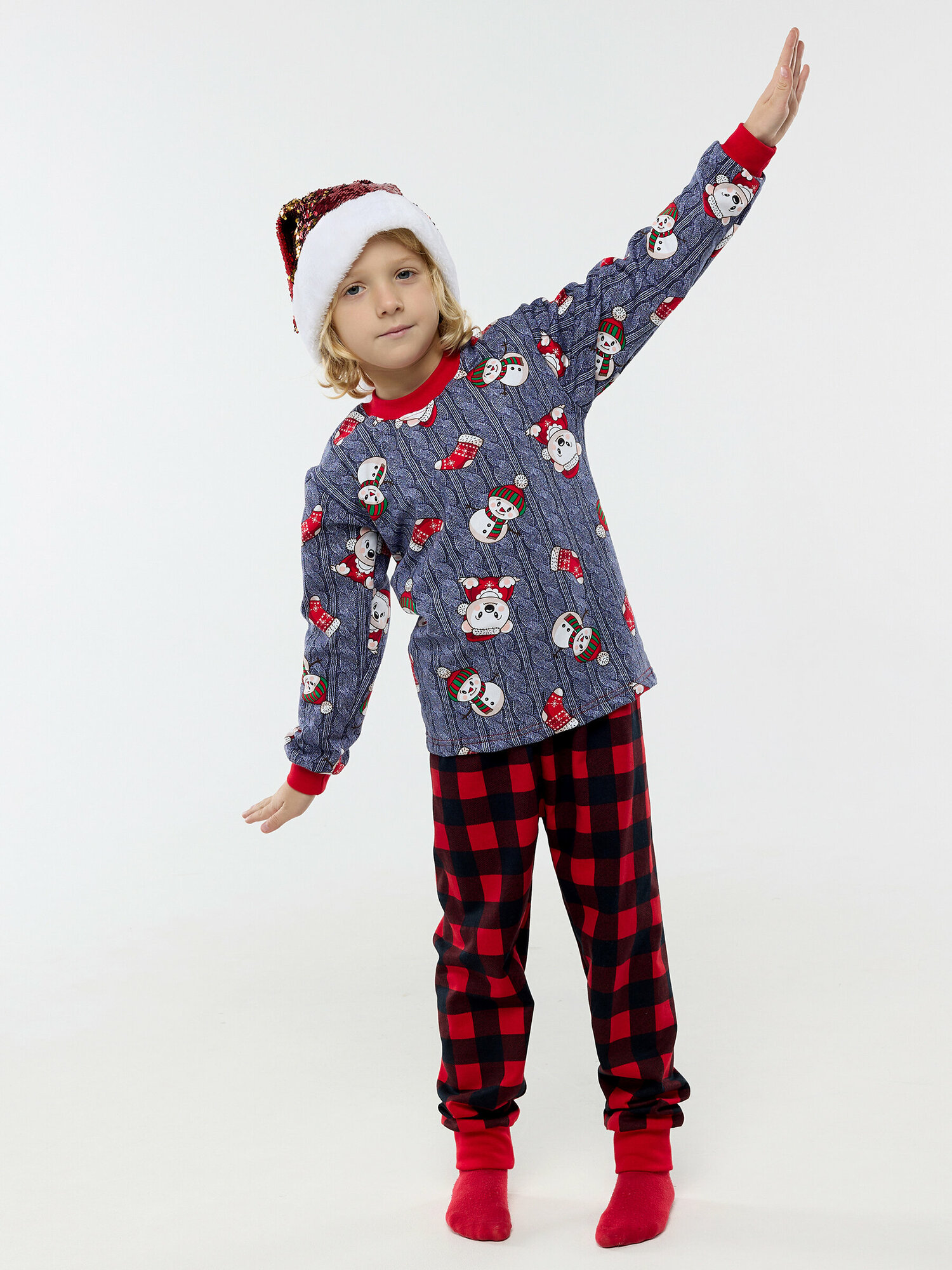 Пижама с начесом, снеговик и штаны в клетку, размер 128 информация: