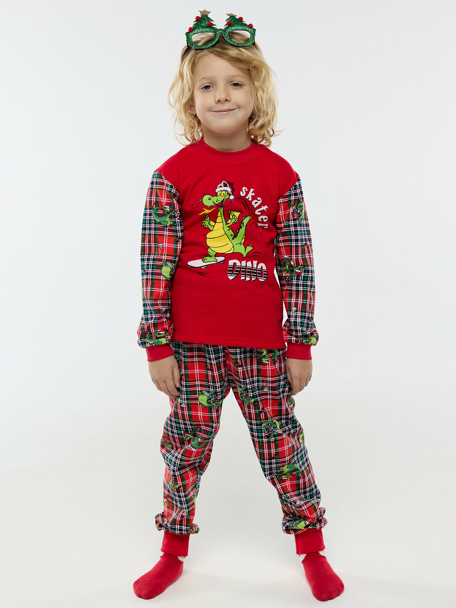 Пижама с начесом, новогодний дракон, красные штаны в клетку, размер 110 информация: