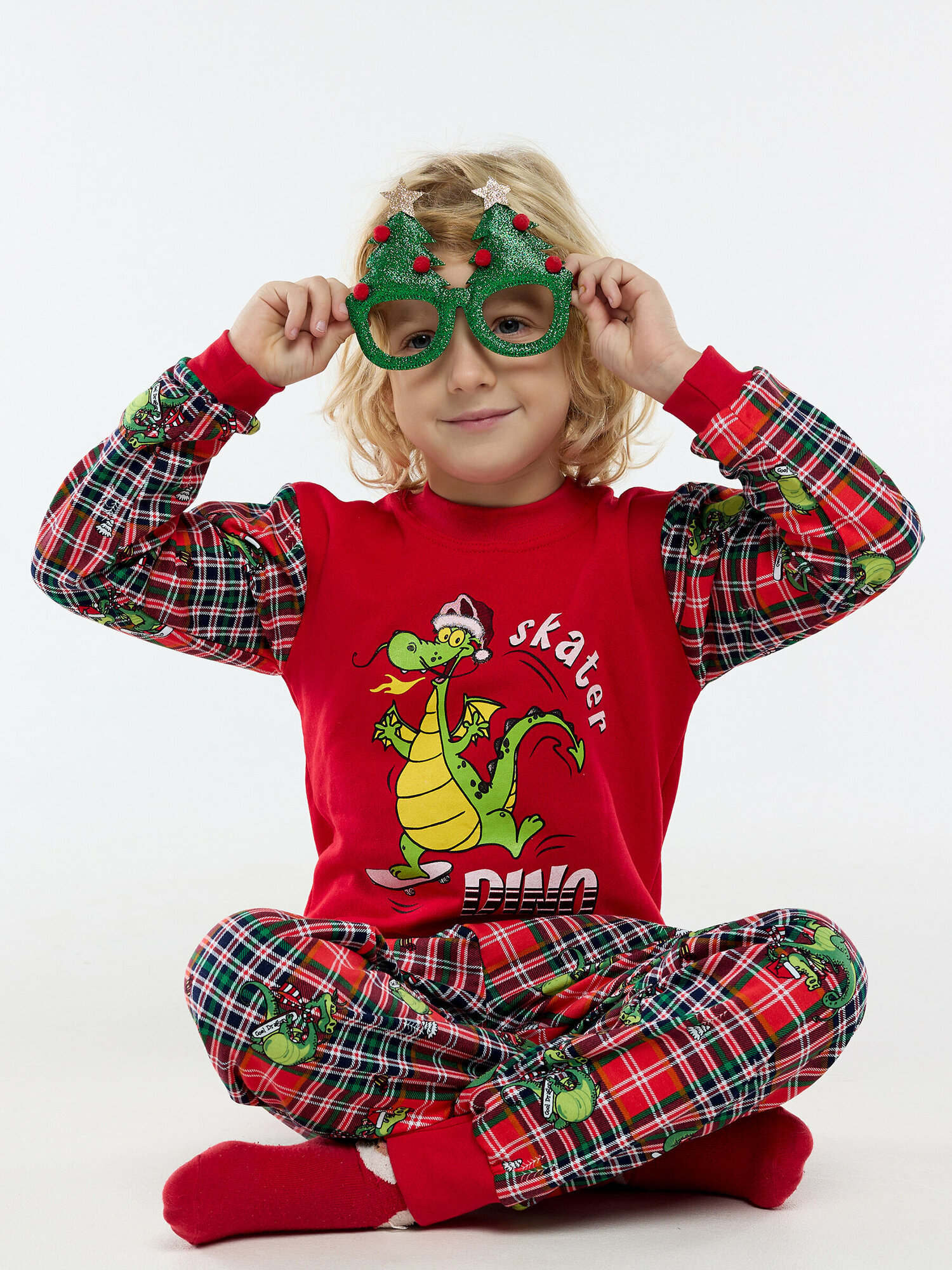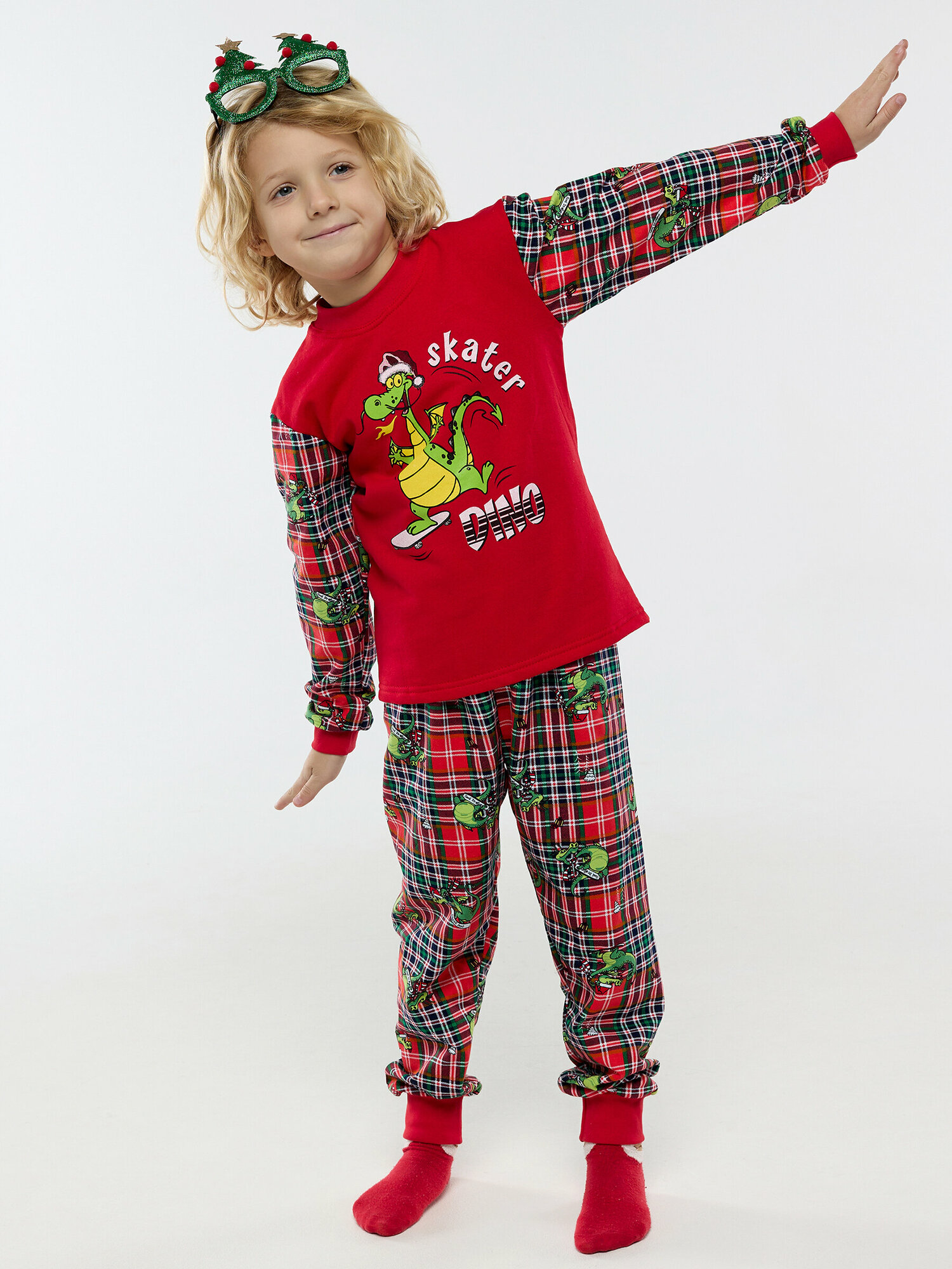10 цен на Пижама с начесом, новогодний дракон, красные штаны в клетку, размер 110