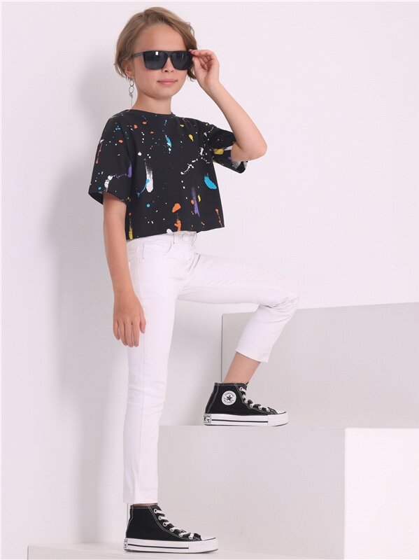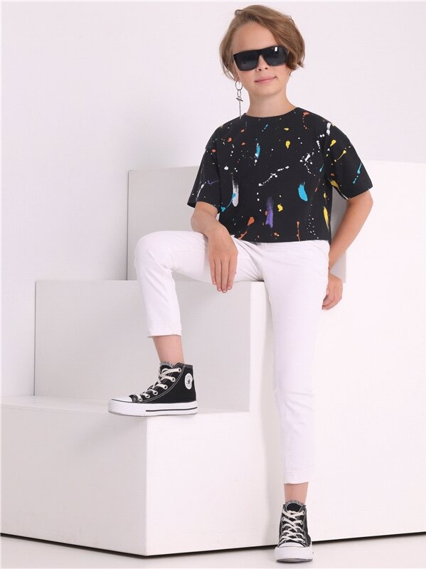 Футболка для девочки укороченная с принтом хлопок 100% Апрель 1ДДФК4346001н/1358/*/5266/*/*/*/* черный,мультиколор 64-128 информация: