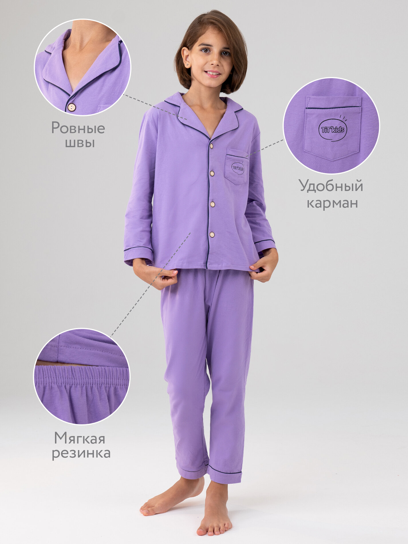 Пижама для девочки детская "TiT’kids" со штанами и рубашкой,цвет фиолетовый, 134-140