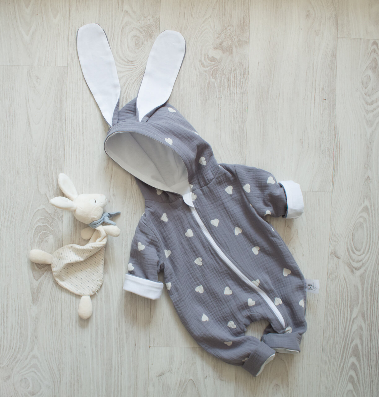Комбинезон из муслина детский 62 размер (1-3 мес), серый с сердечками, MAMINY ZAPISKY, с капюшоном информация: