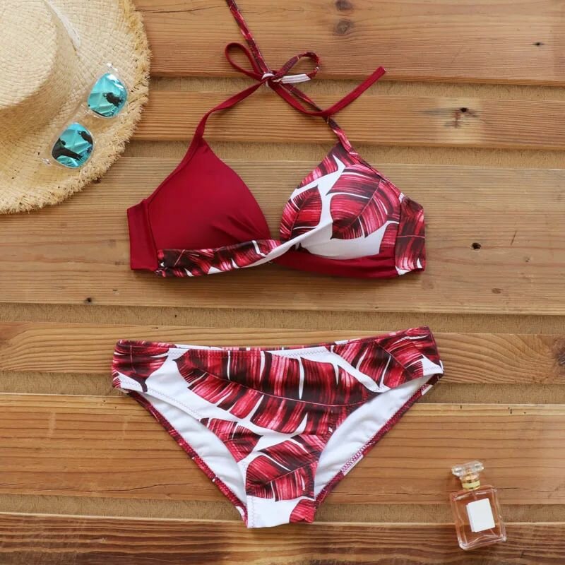 Женский красно-белый раздельный купальник с растительным принтом