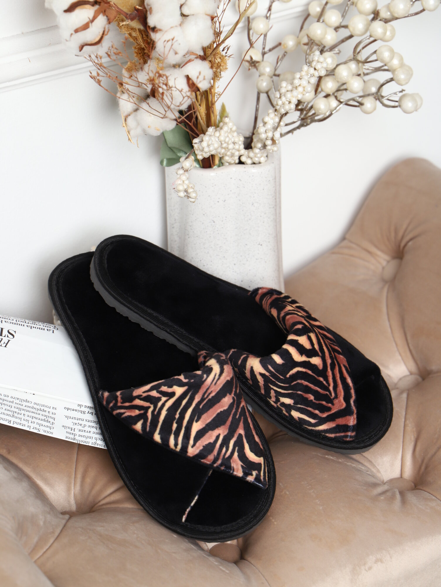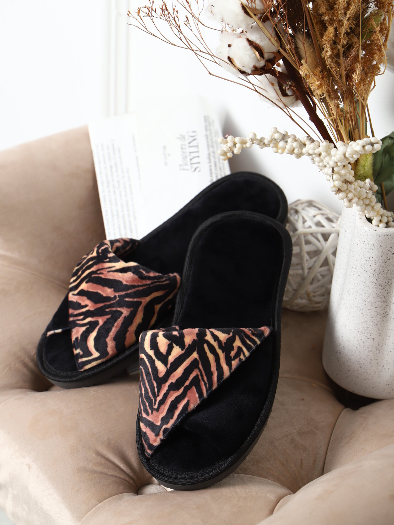 10 цен на Тапки EMOTION DAY «Black Tiger» (женск. велюр откр. нос, внахлёст) р-р: 36-37