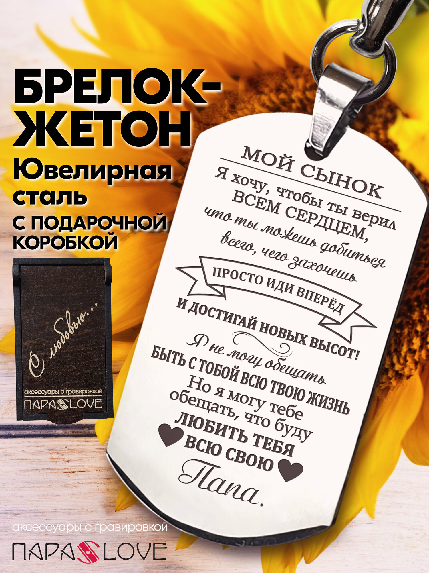 Отзывы на Брелок для ключей мужской с надписью "Мой сынок" от папы с лазерной гравировкой в подарочной коробке. Жетон на сумку, рюкзак, ключи авто и дома.