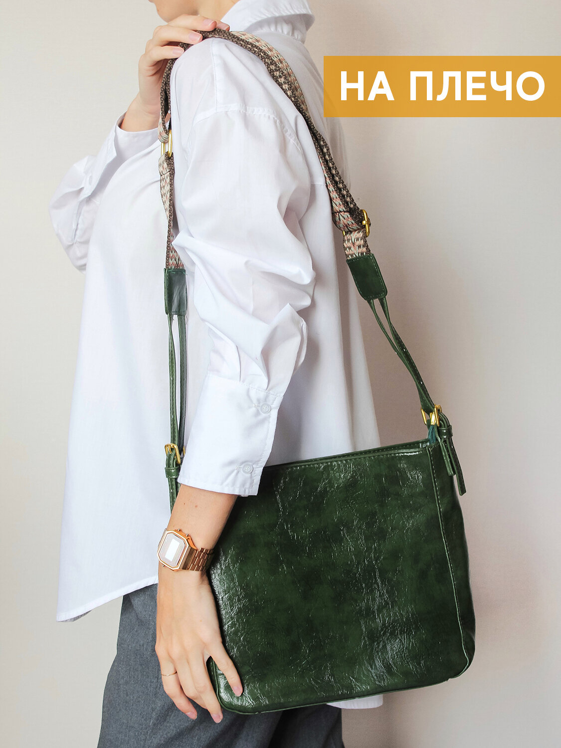 10 цен на Сумка женская с широким ремнем, зеленая (изумруд)