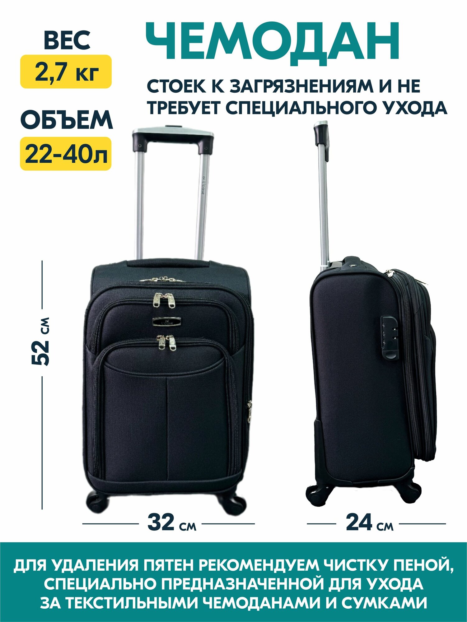 Чемодан на колесах Lcase AMSTERDAM, Черный. Маленький размер S, тканевый, ручная кладь, 52 см, 40 л. Дорожный чемодан на колесиках для путешествий и поездок. информация: