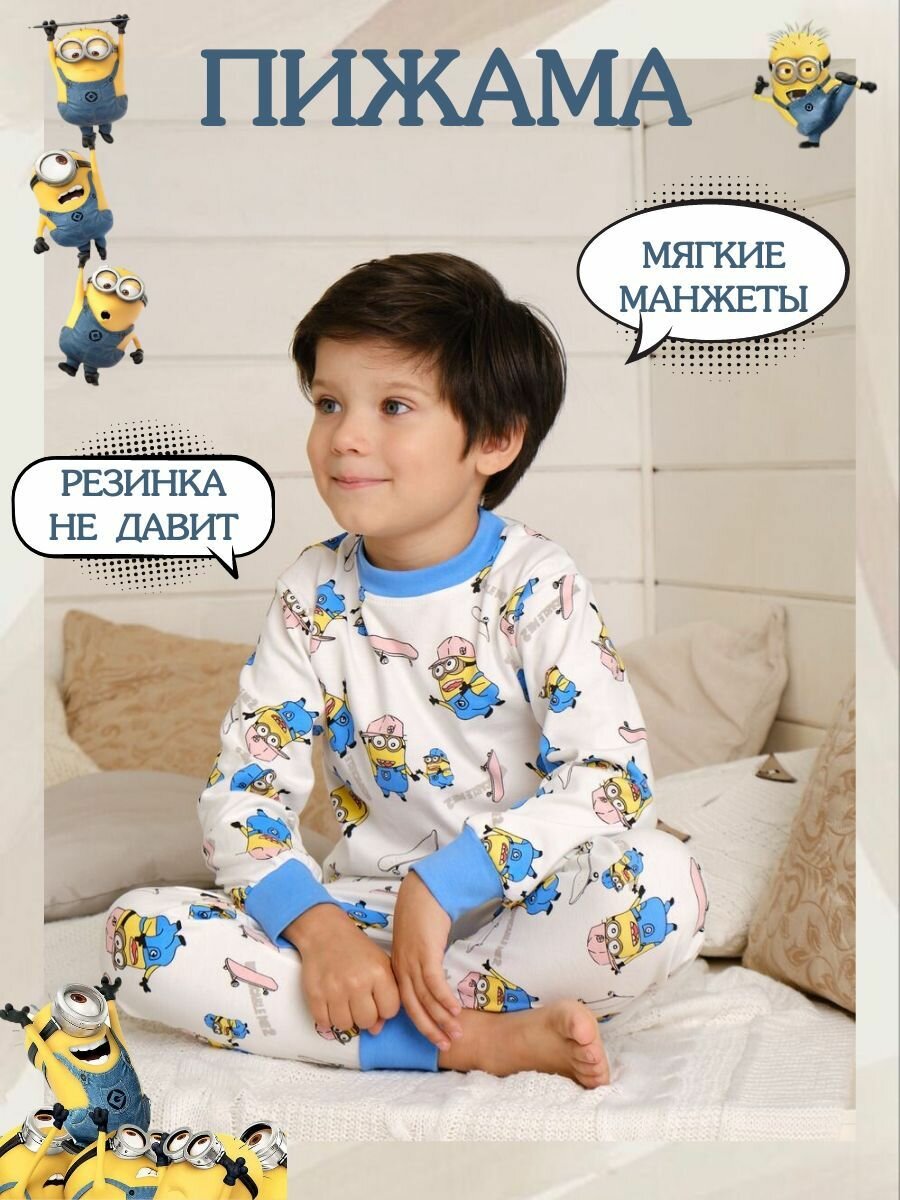 Пижама Fonuters для мальчиков, брюки, лонгслив с манжетами, Хлопок, Миньен, размер 100-110, белый, голубой информация: