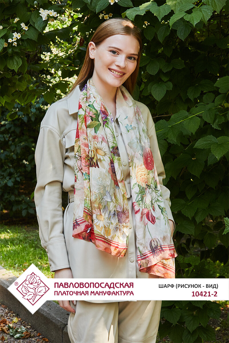 Шарф шелковый (крепдешин), Павловопосадские платки" 10421", вид 2, 43х150 см информация: