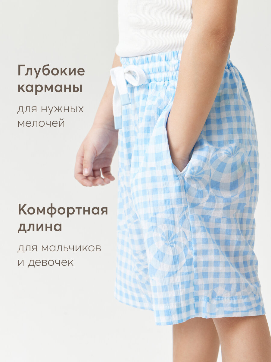 88120, Шорты детские хлопковые Happy Baby, шорты для мальчика и для девочки, на завязках, летние, для пляжа, голубые в клетку, размер 122-128 1 136 ₽