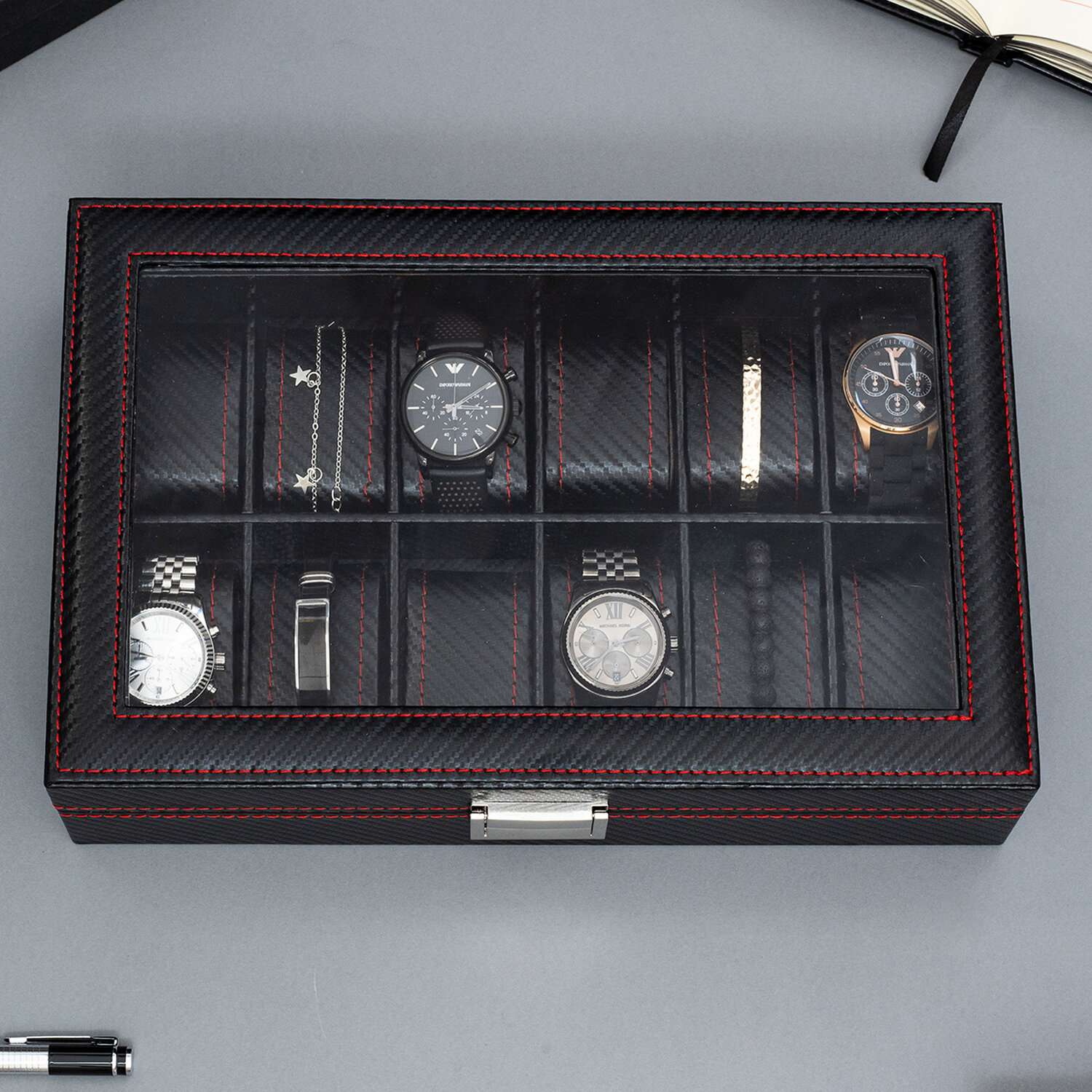 Шкатулка для хранения 12 часов CloxBox MTW90 Экокожа, черная с красной строчкой информация: