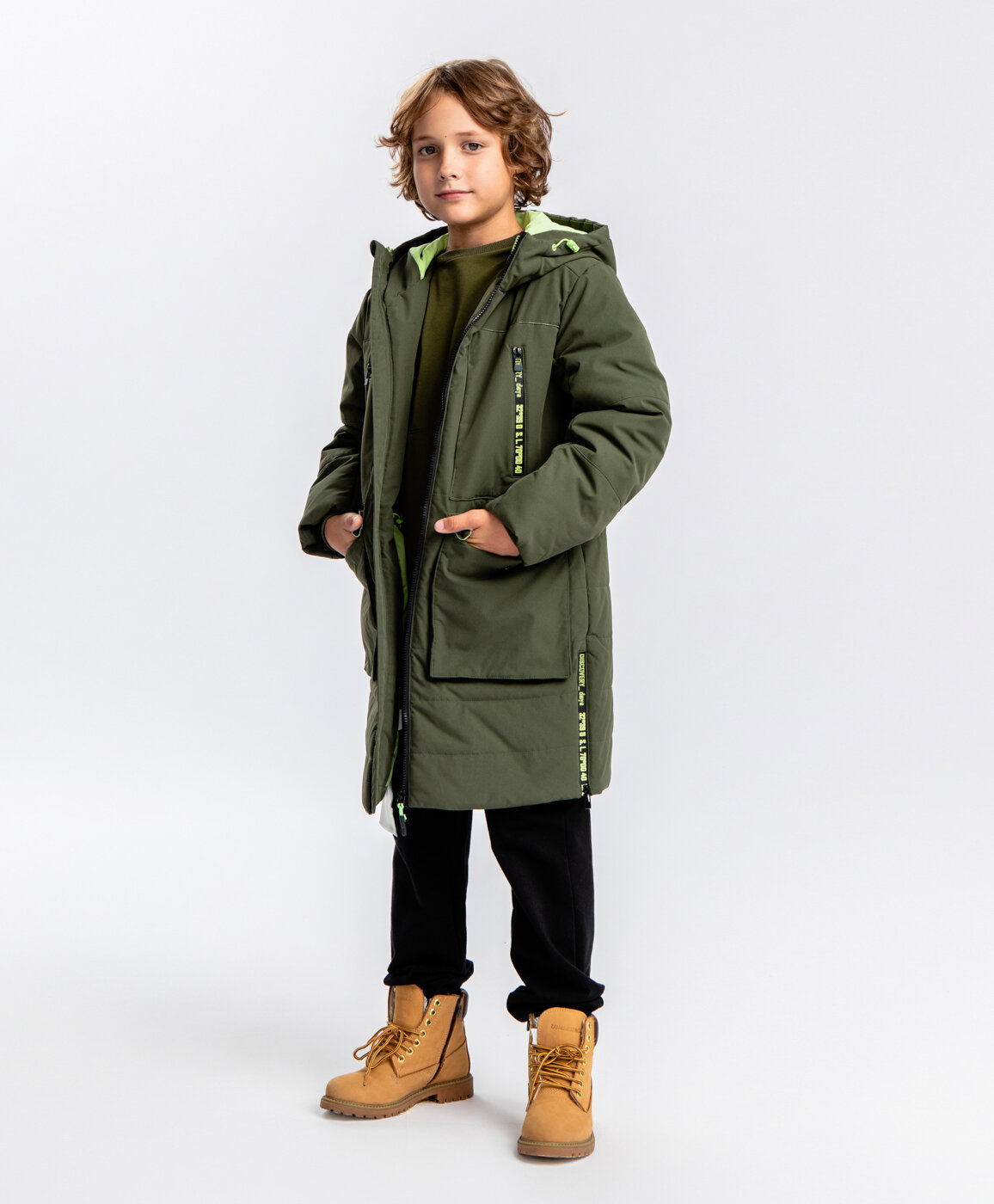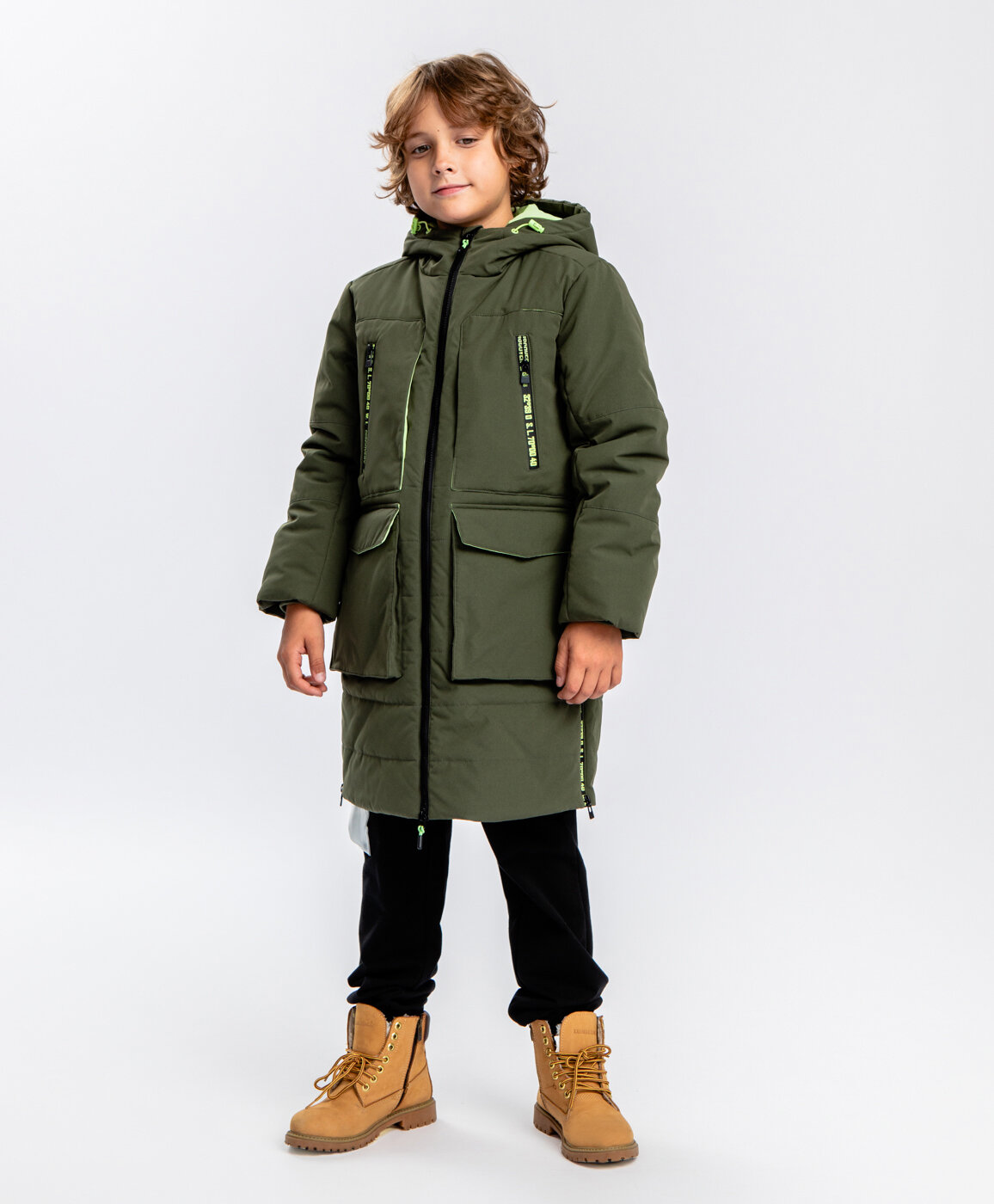 10 цен на Пальто демисезонное с капюшоном зеленое Button Blue для мальчиков, размер 158, мод. 223BBBJC45024800