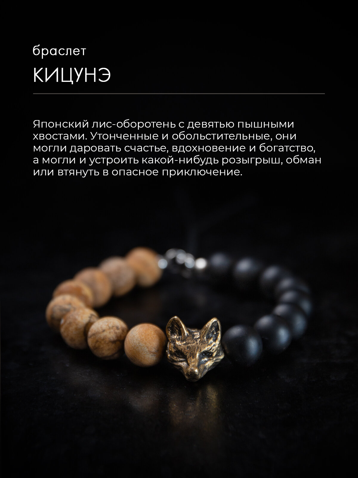 Отзывы на Кицунэ- браслет мужской / женский из натуральных камней ( яшма и оникс ) с бусиной из бронзы в виде лисы, размер 15-17,5