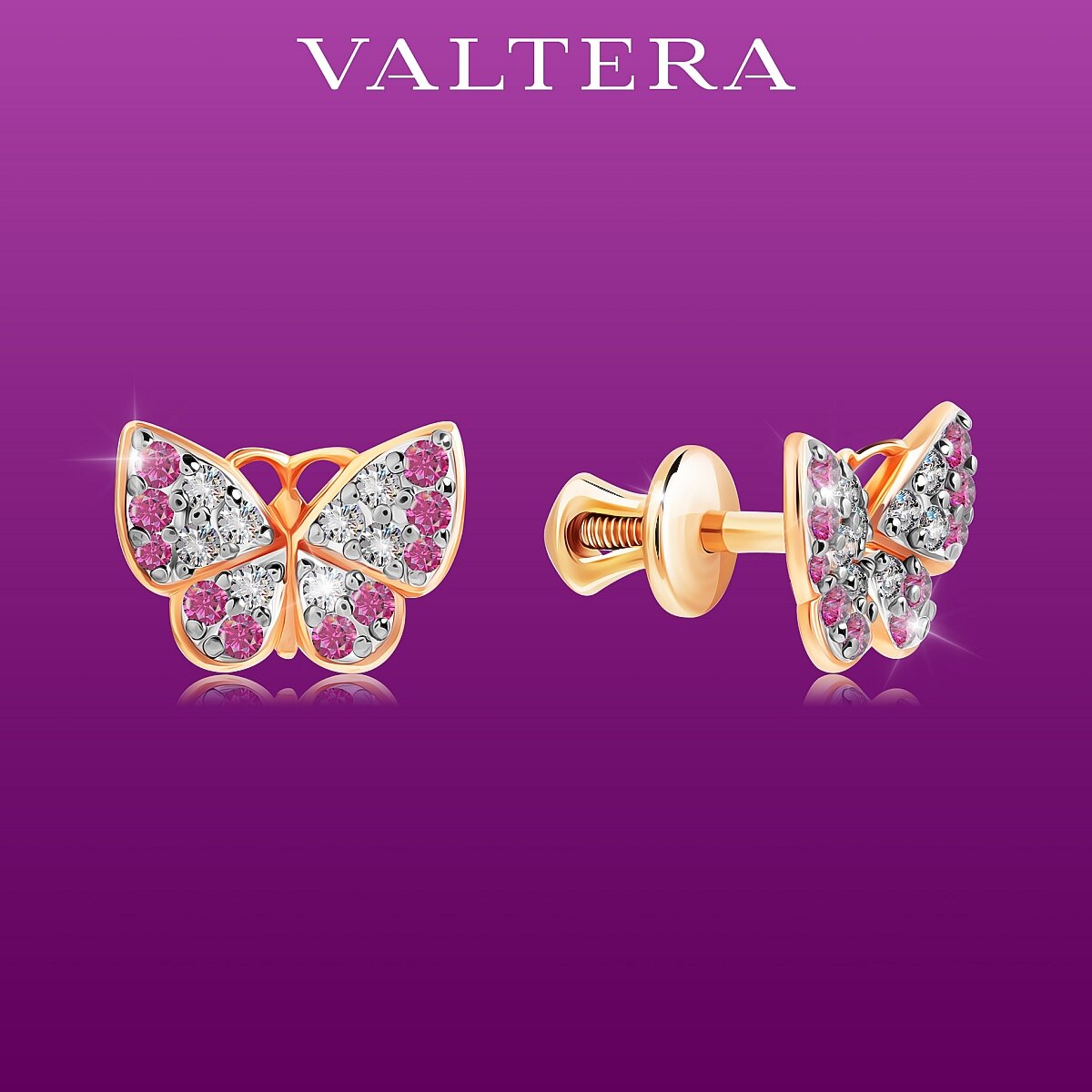 Отзывы на Серьги VALTERA / пусеты / гвоздики / бабочки / серебро 925 пробы / покрытие - красное золото 585 пробы / кубический цирконий