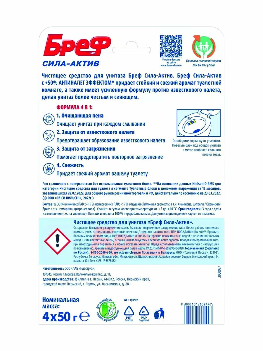 Блок туалетный подвесной твердый 4 шт. х 50 г BREF (Бреф), Сила-Актив "Лимонная Свежесть/Океанский бриз", 2293911