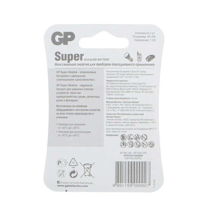 GP Батарейка алкалиновая GP Super, AA, LR6-2BL, 1.5В, блистер, 2 шт. информация: