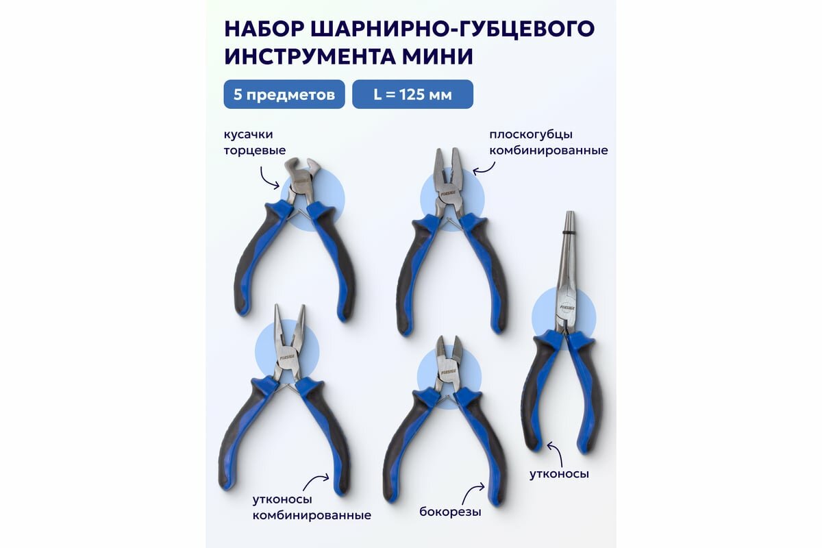 10 цен на Набор шарнирно-губцевого инструмента мини 5пр. 5''-125мм(бокорезы, плоскогубцы, утконосы, утконосы комбинированные, кусачки торцевые),в блистере