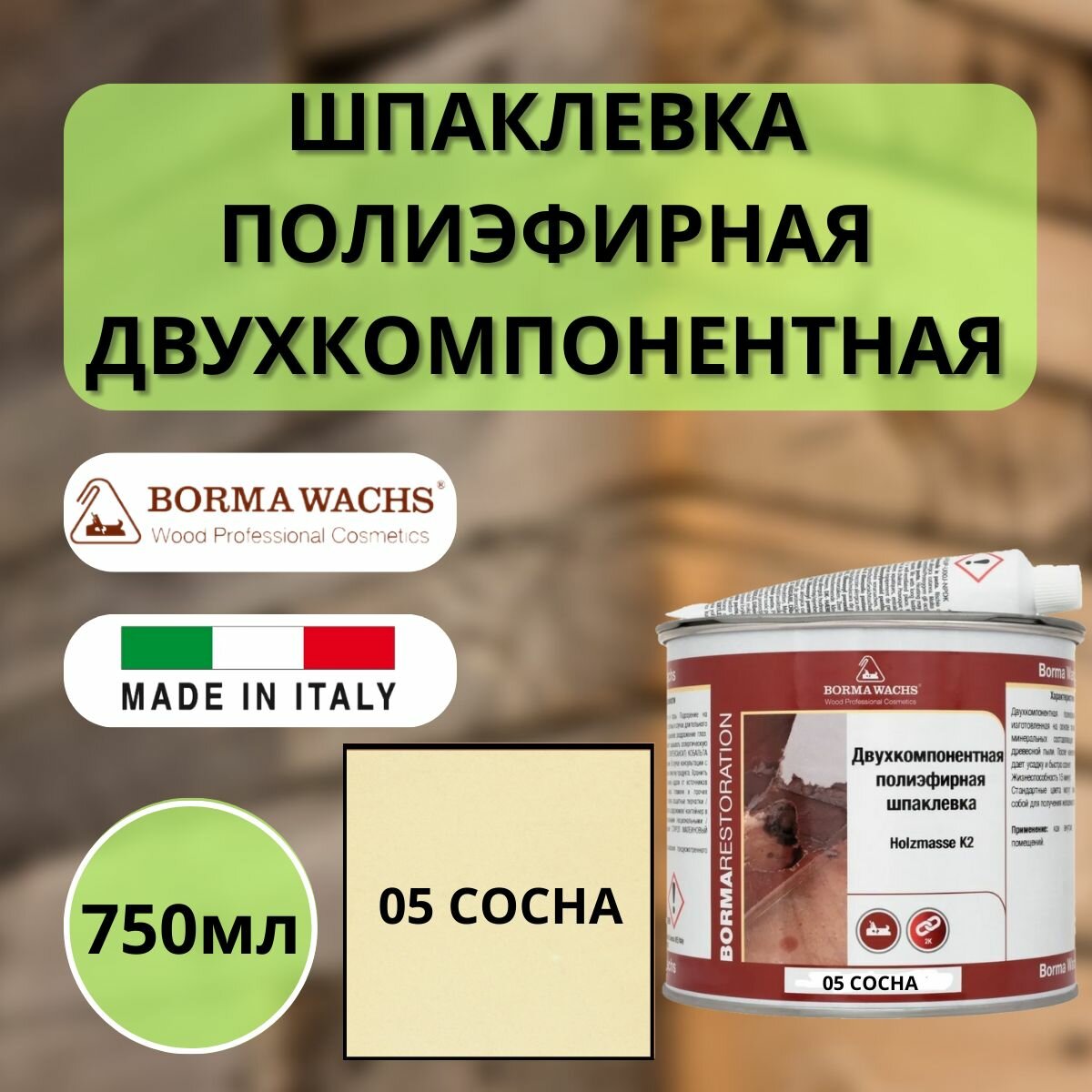 Шпаклевка полиэфирная двухкомпанентная Сосна 05 Borma HOLZMASSE K2 750мл 1960PI-6T информация: