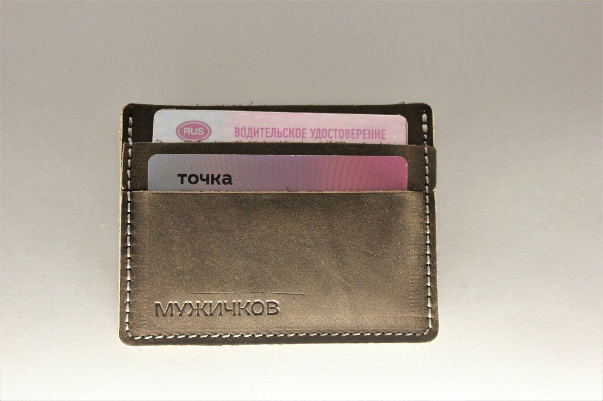 Картхолдер Мужичков из натуральной кожи, коричневый с серой прострочкой информация: