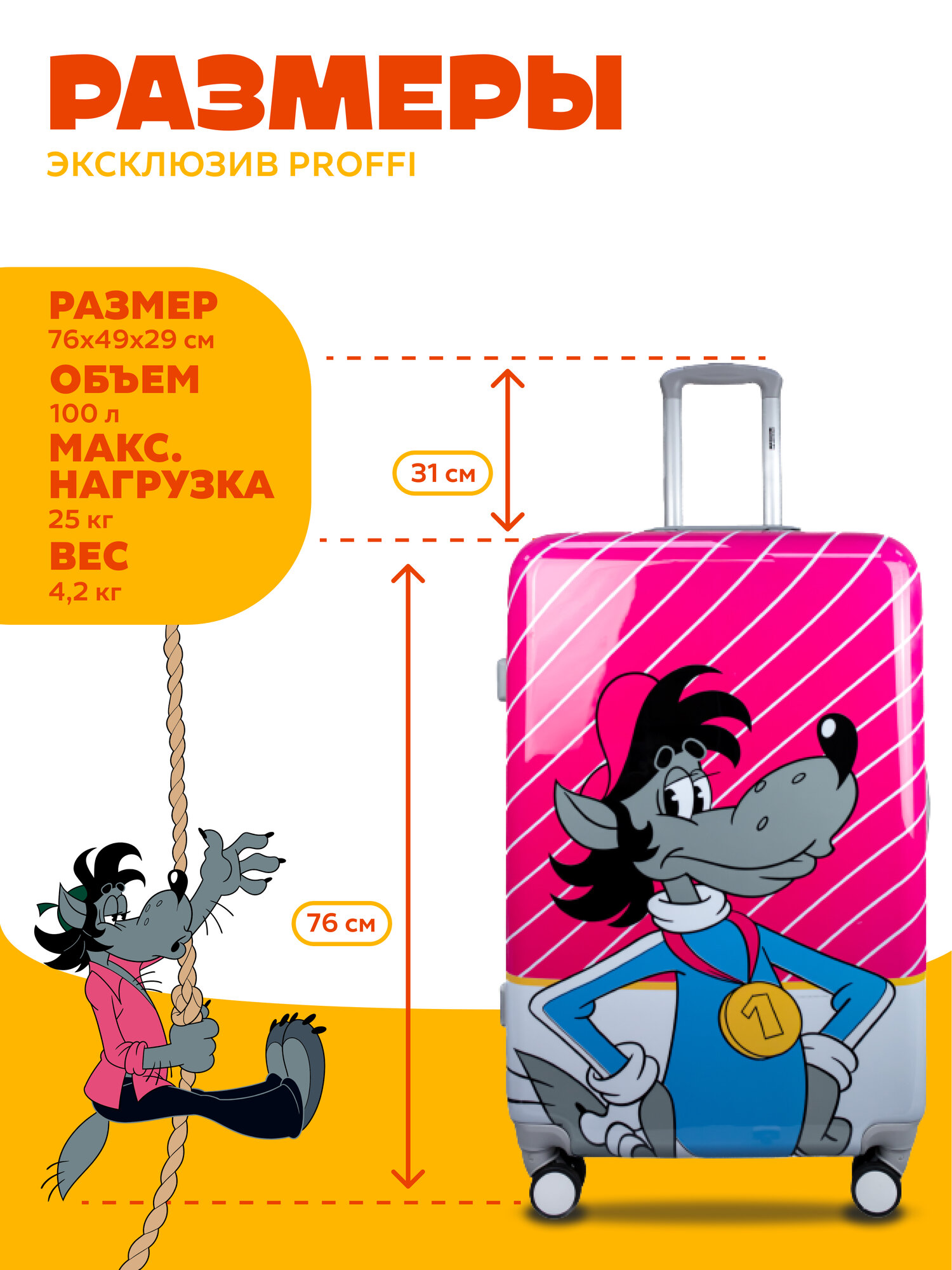 Чемодан пластиковый Ну погоди волк 4х колесный L информация:
