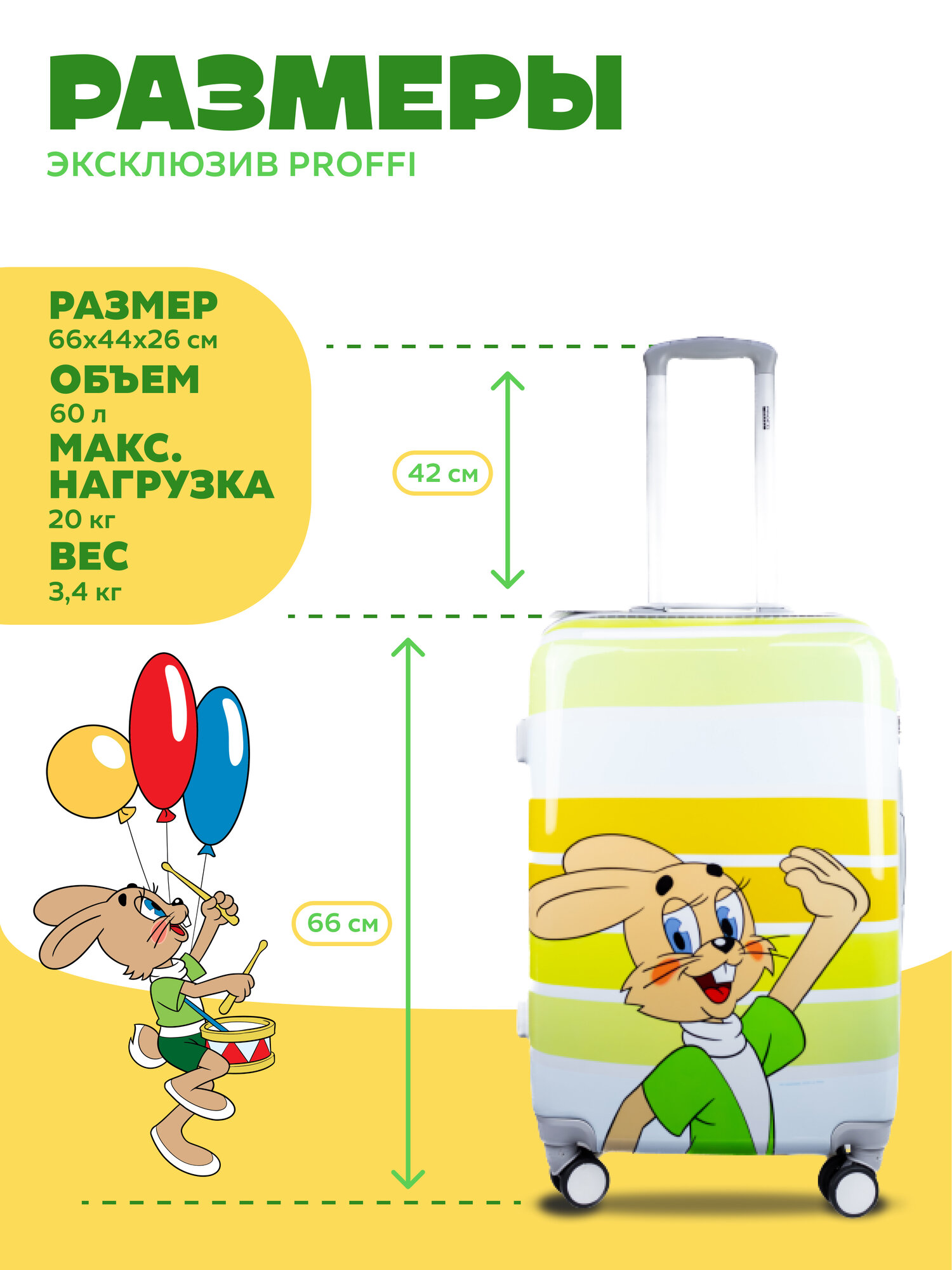 Чемодан пластиковый Ну погоди заяц 4х колесный M информация: