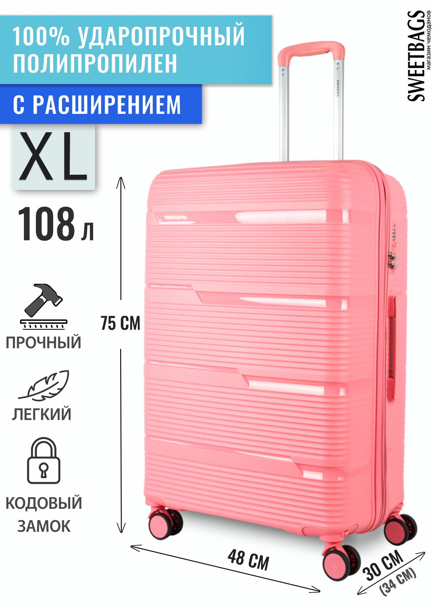 Отзывы на Чемодан Sweetbags большой из полипропилена с расширением на 4-х съемных колесах с кодовым замком (Orlean) розовый XL