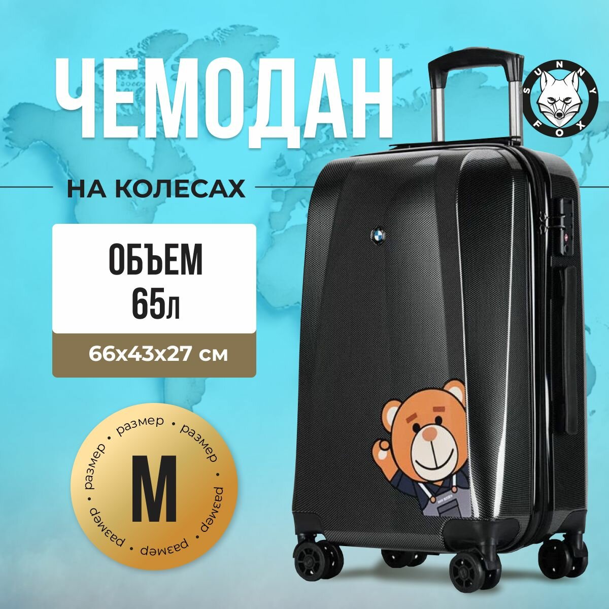 Стильный чемодан на колёсах Sunny fox Carbon черный размер M / Дорожный чемодан на колёсах для путешествий. Серия БМВ информация: