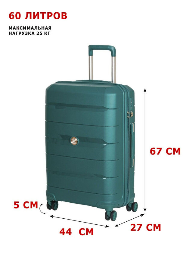 Чемодан M облегченный из полипропилена Supra Luggage STS-2004-M,Marine Green, замок TSA, 60 литров, 4 колеса с поворотом на 360 градусов, 44X27X67 см информация: