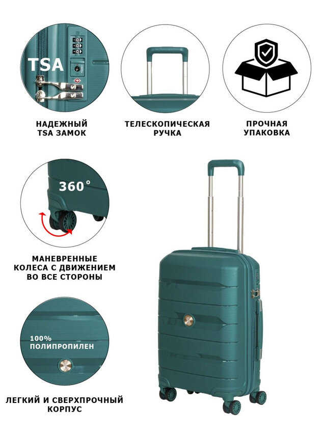 10 цен на Чемодан M облегченный из полипропилена Supra Luggage STS-2004-M,Marine Green, замок TSA, 60 литров, 4 колеса с поворотом на 360 градусов, 44X27X67 см