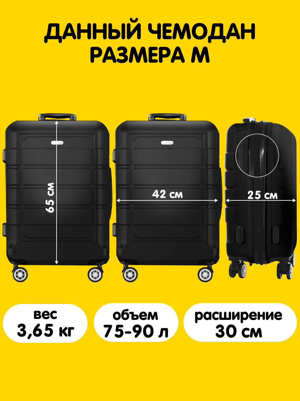 Дорожный чемодан на колесах M маленький, ударопрочный из полипропилена черный информация: