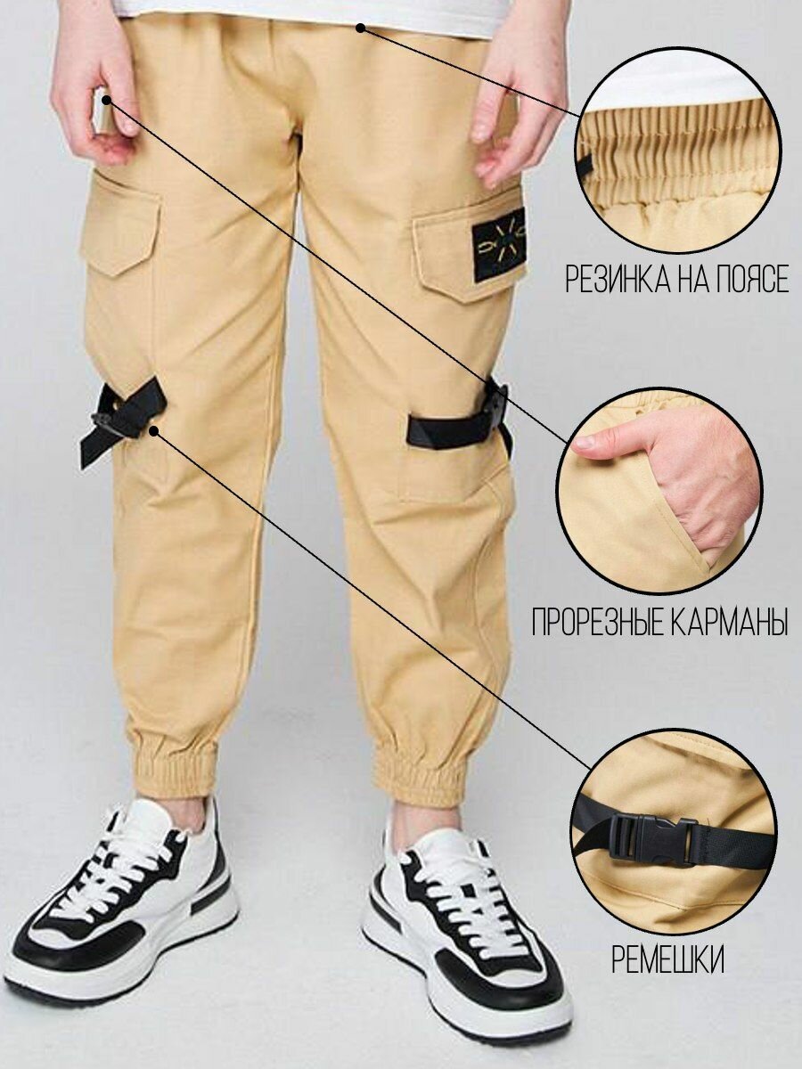 10 цен на Джоггеры бежевые подростковые на резинке с черными ремешками размер M