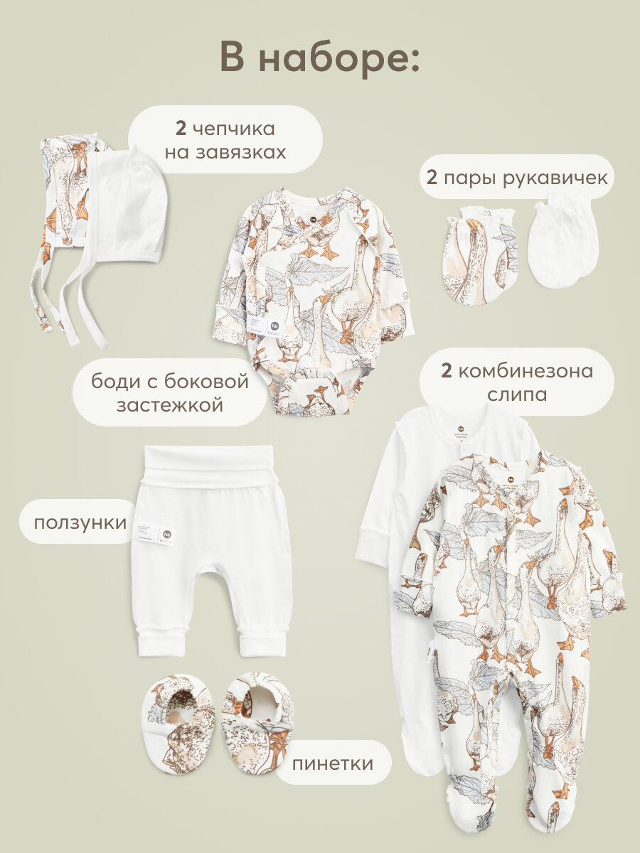 10 цен на 90111, Набор одежды для новорожденных Happy Baby, хлопок, 9 предметов, на выписку, подарочный, молочный, с гусями, рост 56