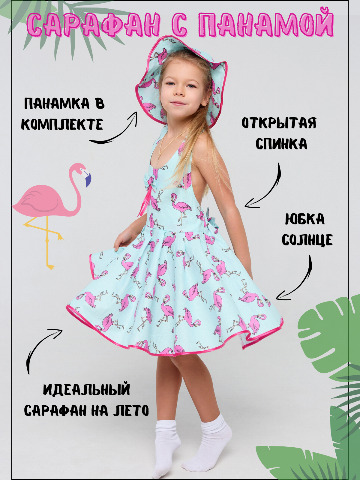 Летний сарафан с панамой, голубой, розовый фламинго, размер 104 информация: