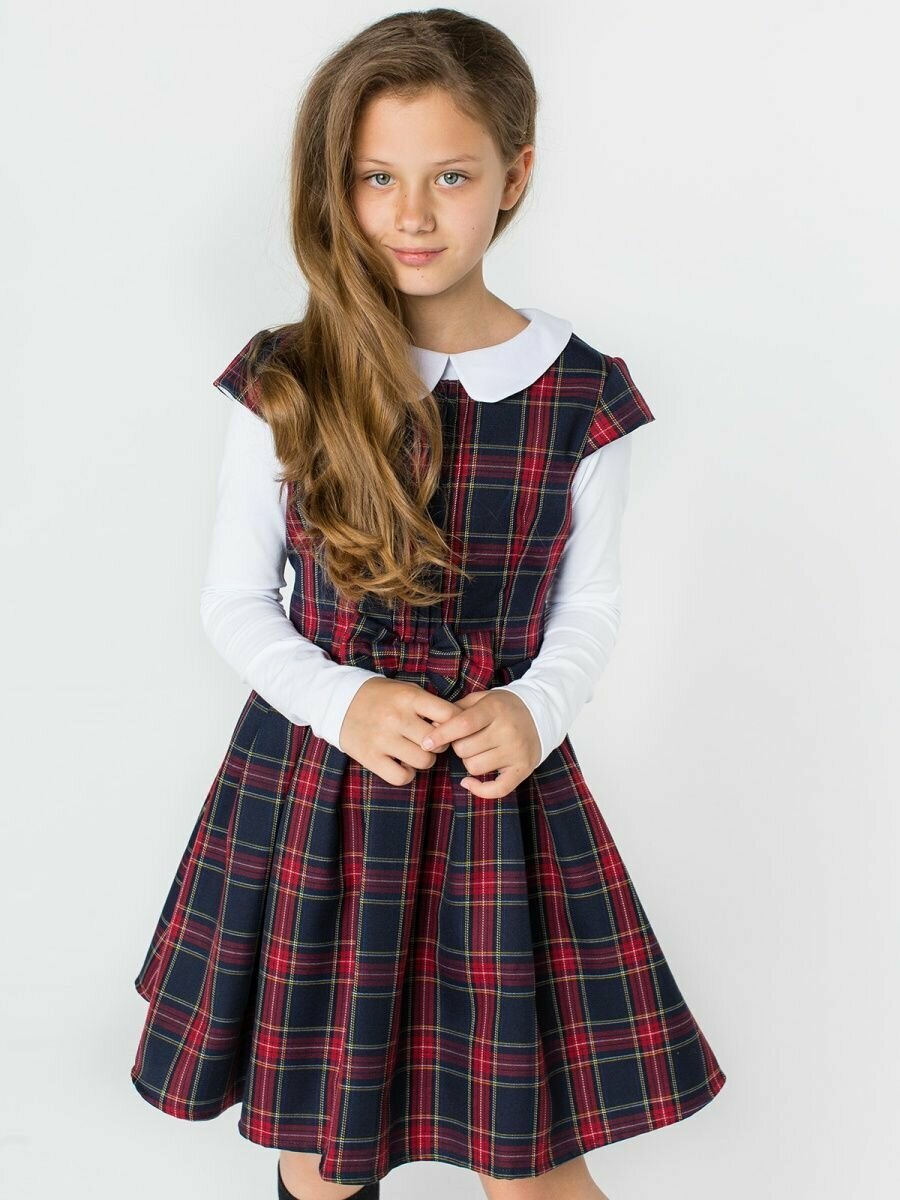 10 цен на Сарафан для девочки школьный синий короткий модный в клетку, размер 158