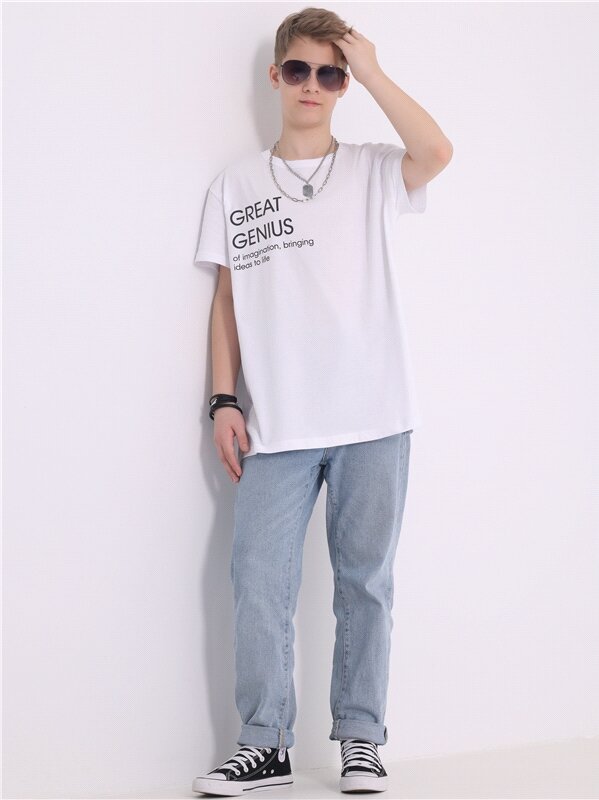 Футболка для мальчика белая оверсайз с принтом Апрель 1ПДФК4518001/1311/31/*/3296/*/*/* белый,черный 80-152 информация: