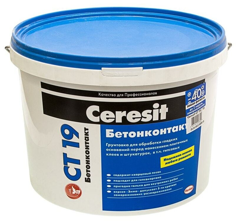 Грунтовка Ceresit CT 19 Бетонконтакт (зимняя формула), 15 кг/Церезит/готовый акриловый грунт/укрепляющая/строительная для внутренних и наружных работ
