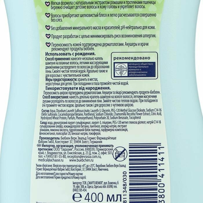 Шампунь детский Bubchen с ромашкой и протеинами пшеницы, с рождения, 400 мл (комплект из 2 шт) информация:
