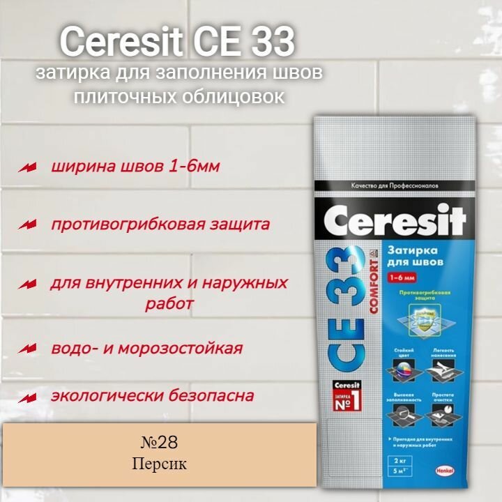Затирка для швов плиточных облицовок до 6мм Церезит СЕ 33 Персик №28, 2кг информация: