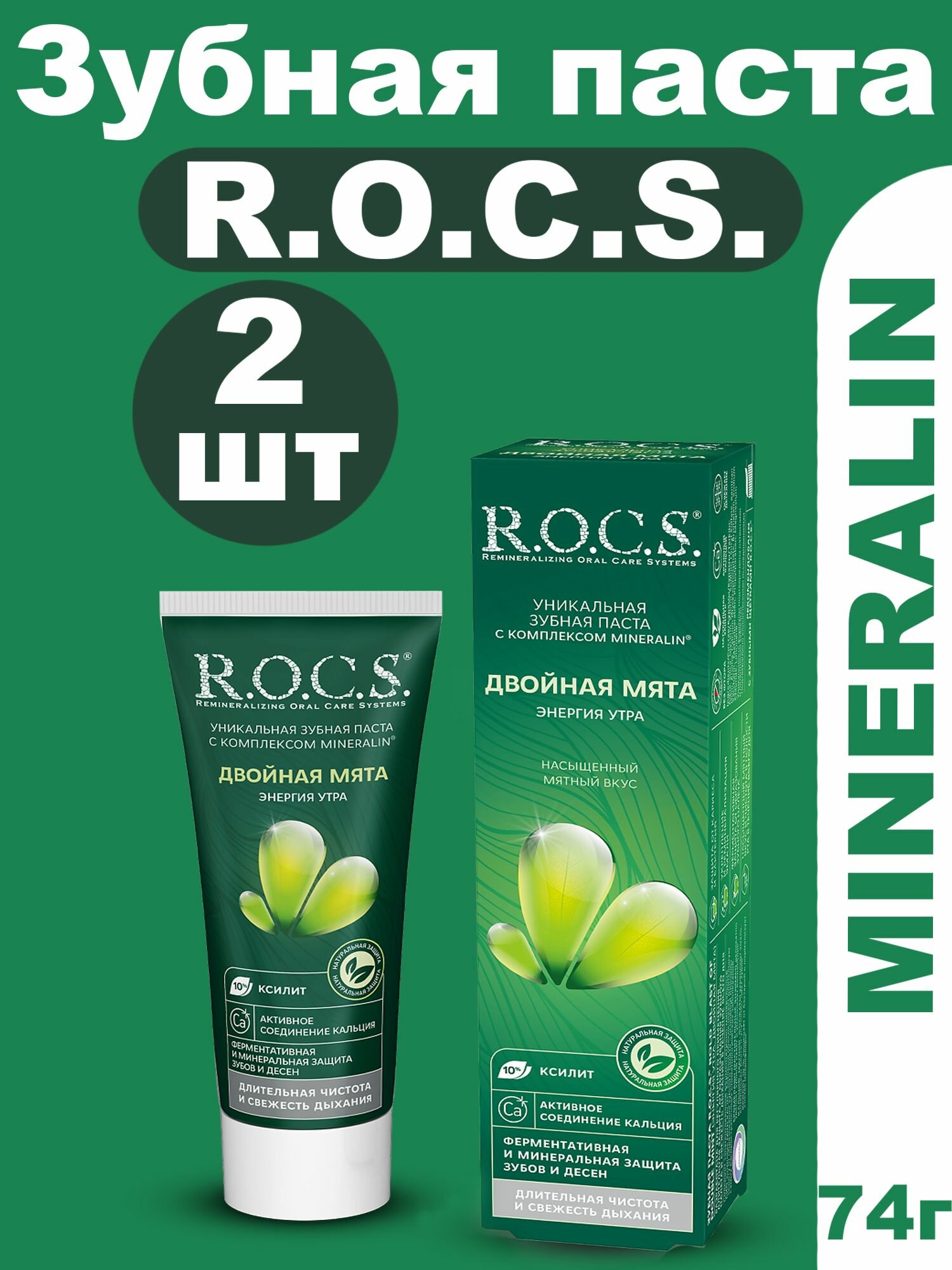 Зубная паста R.O.C.S.(2 штуки) Энергия утра, двойная мята, 60 мл, 74 г информация: