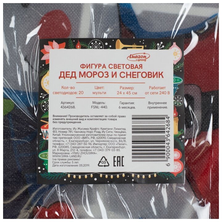 Светодиодная фигура Дед Мороз и снеговик 24 45 см, пластик, 220 В, свечение мульти (RG/RB) информация: