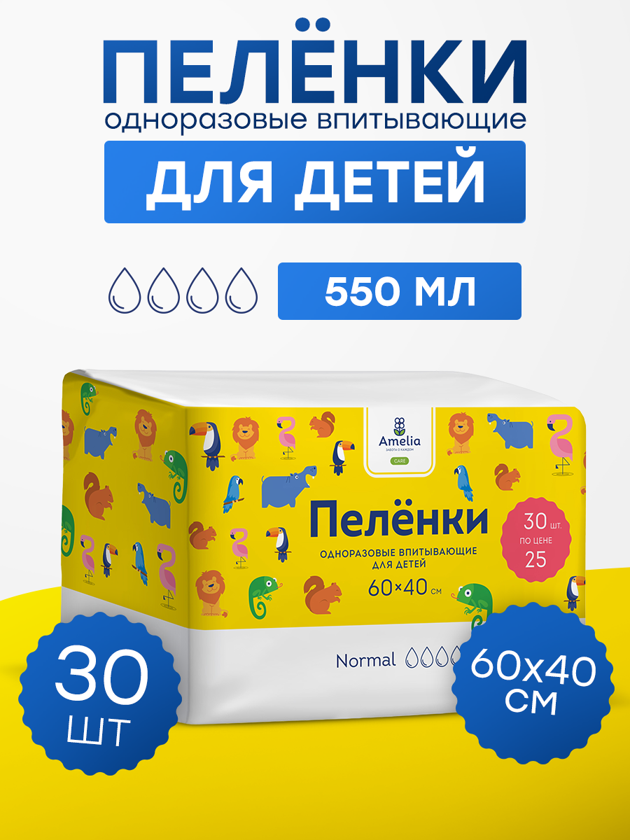 Детские одноразовые пеленки Amelia, размер 60х40, 30 штук информация: