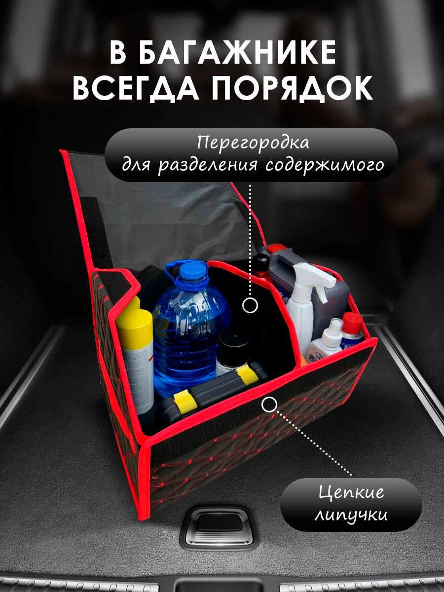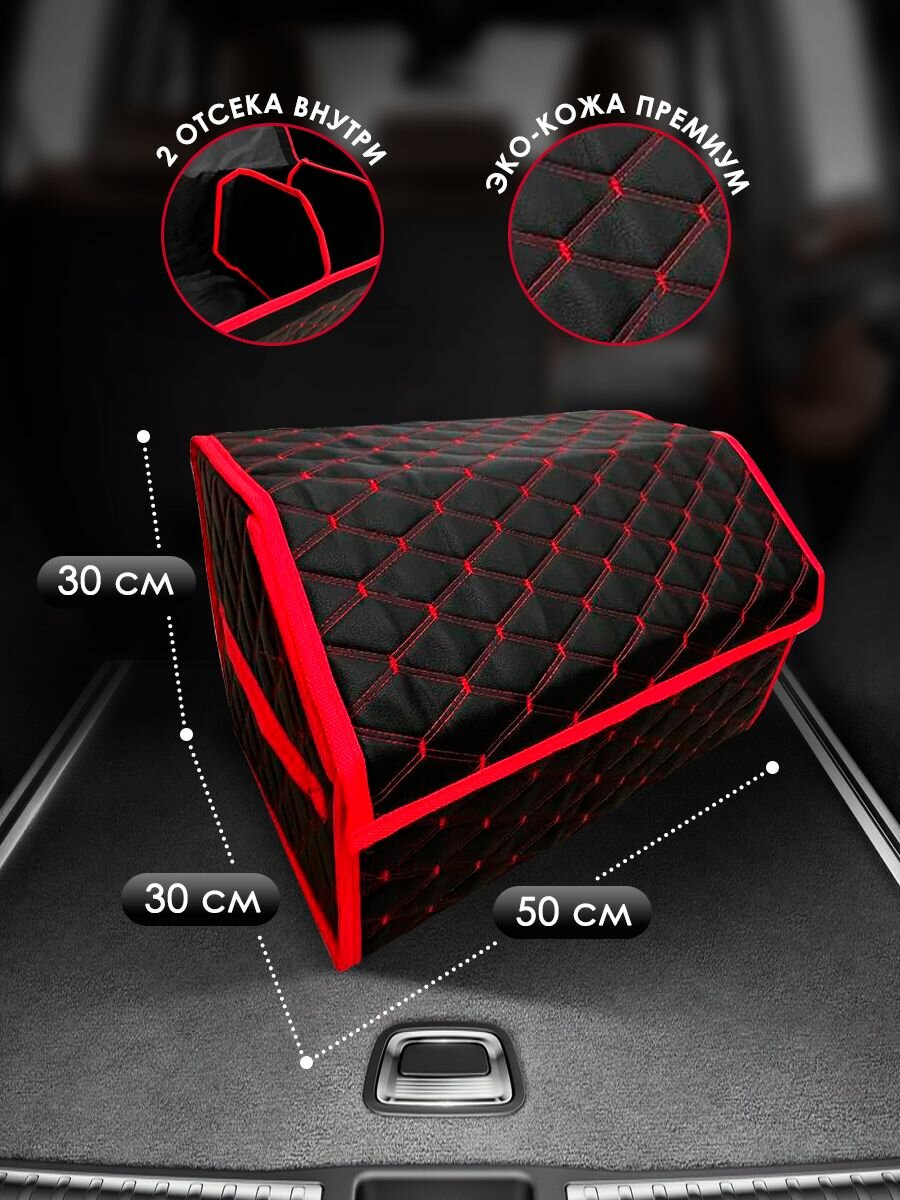 Сумка-органайзер в багажник Мерседес-Бенц б-класс (2022 - 2024) хэтчбек 5 дверей / Mercedes-Benz B-Class, экокожа, Черный с красной строчкой, ромб, размер 50x30x30см информация: