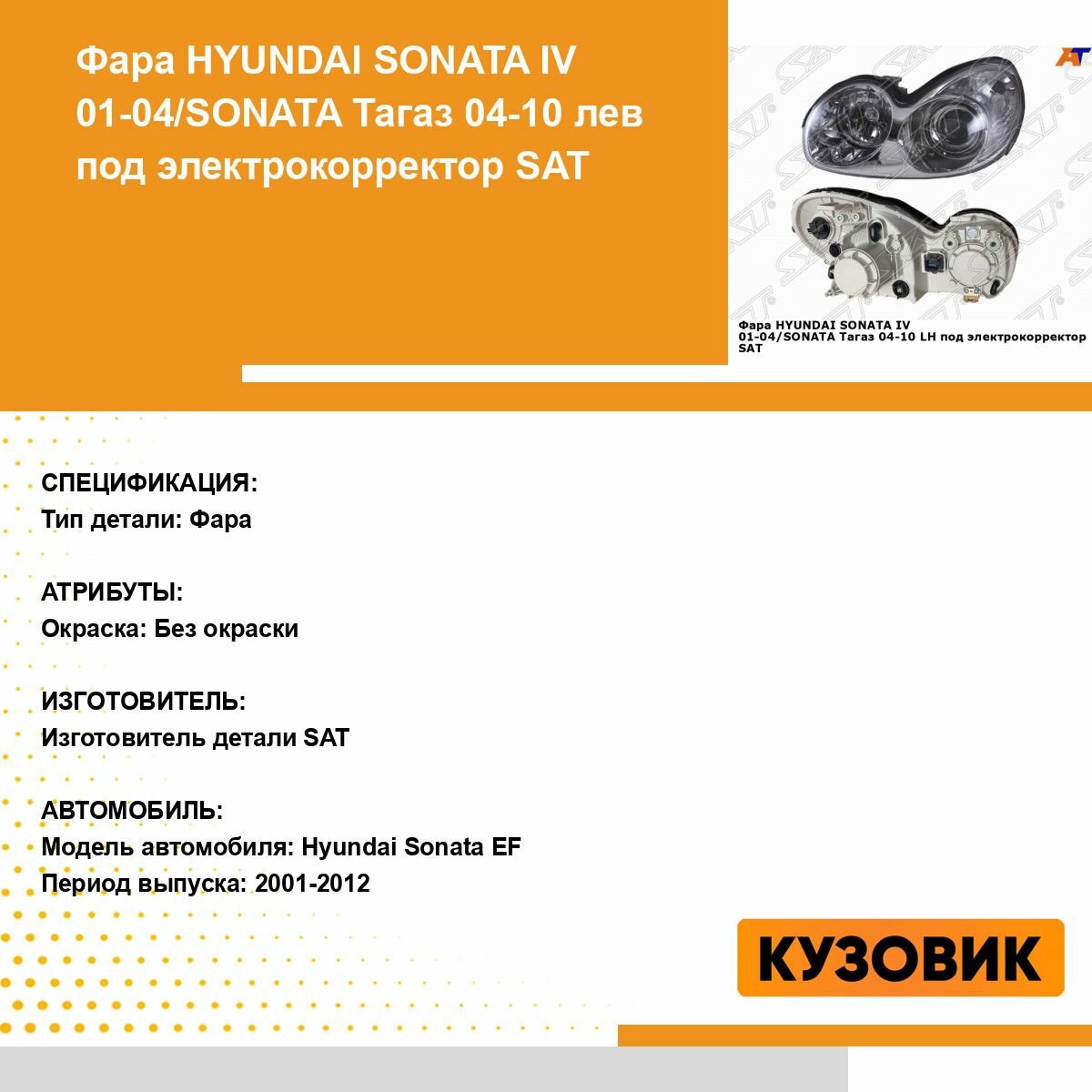 10 цен на Фара левая для Хендай Соната 4 HYUNDAI SONATA 4 (2001-2004) SONATA Тагаз (2004-2010) под электрокорректор новая качественный пластик SAT