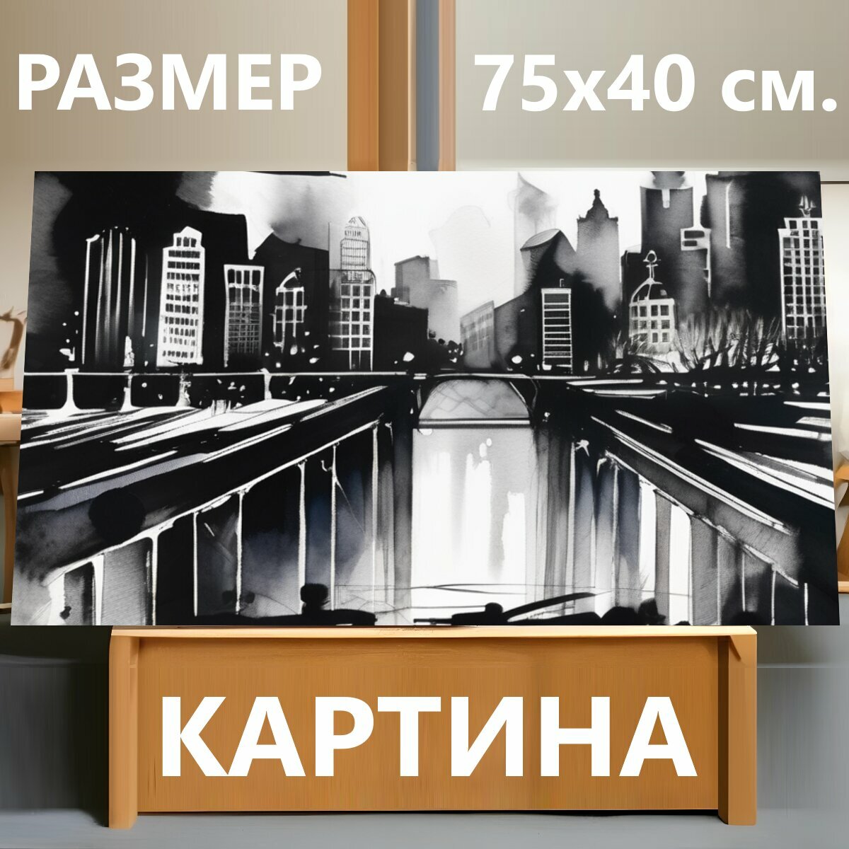 10 цен на Картина на холсте "Черный город, в стиле акварель" на подрамнике 75х40 см. для интерьера